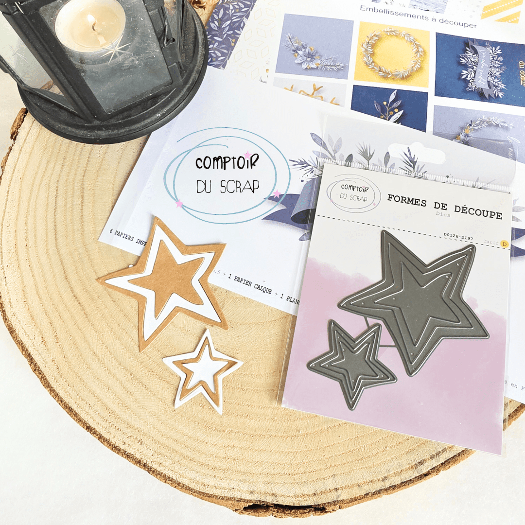 Les matrices de découpe LUMIÈRES D’ÉTOILES de la collection HIVER DE VELOURS de DIY de scrapbooking et de carterie. Conçues par Comptoir du scrap, ces dies en métal sont polyvalents, permettant de découper non seulement du papier, mais aussi des matériaux fins tels que le plastique, la créamousse et le liège. Leur compatibilité avec la plupart des machines de découpe et d’embossage comme Big Shot, Sizzix, Cuttlebug et Happy Cut en fait un outil indispensable pour tous les amateurs de loisirs créatifs.